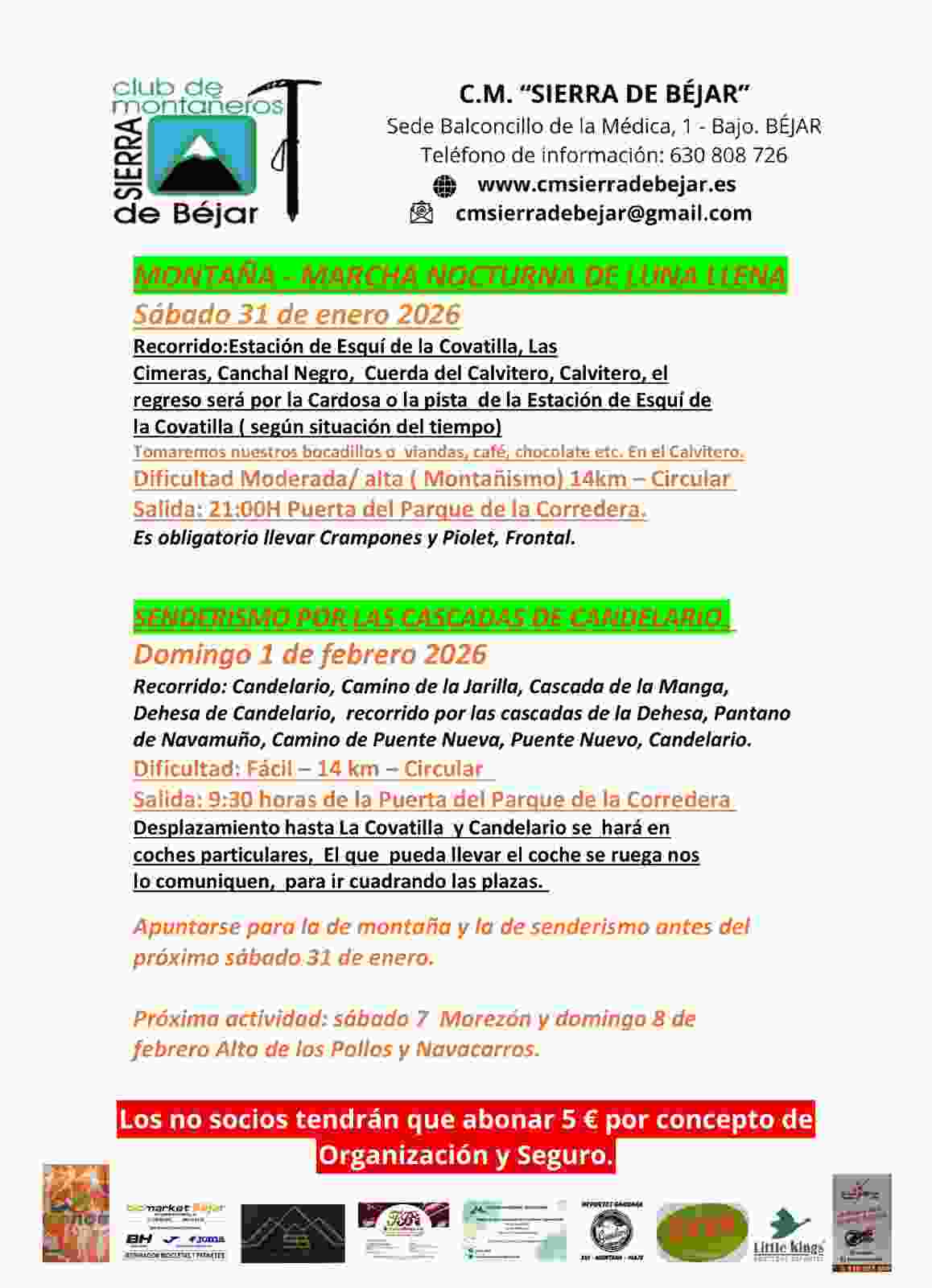 ACTIVIDADES PARA EL SABADO 31 DE ENERO Y DOMINGO 1 DE FEBRERO DE 2026 MONTAÑA: MARCHA NOCTURNA “LUNA LLENA” – SENDERISMO “CASCADAS DE CANSELARIO” Por cmsierradebejar|2026-01-28T19:46:34+01:0026 de enero, 2026|Actividades montañeras|Sin comentarios Comparta esta información en su red Social favorita! FacebookTwitterLinkedInRedditWhatsappTumblrPinterestVkEmail Artículos relacionados REPORTAJE DE LA MARCHA DEL DOMINGO DIA 14 DE ENERO DE 2024 Galería REPORTAJE DE LA MARCHA DEL DOMINGO DIA 14 DE ENERO DE 2024 REPORTAJE DE LA MARCHA DEL OTOÑO BEJARANO Galería REPORTAJE DE LA MARCHA DEL OTOÑO BEJARANO MARCHA OTOÑO INFANTIL Galería MARCHA OTOÑO INFANTIL MARCHA SENDERISTA – LAGUNILLA – VALDELAGEVE – POR RIO CUERPO DE HOMBRE Galería MARCHA SENDERISTA – LAGUNILLA – VALDELAGEVE – POR RIO CUERPO DE HOMBRE MARCHA A GREDOS – “RONCESVALLES” Galería MARCHA A GREDOS – “RONCESVALLES” Deja tu comentario Cancelar la respuestaComentar Guardar mi nombre, email y sitio web en este navegador para la próxima vez que comente.
